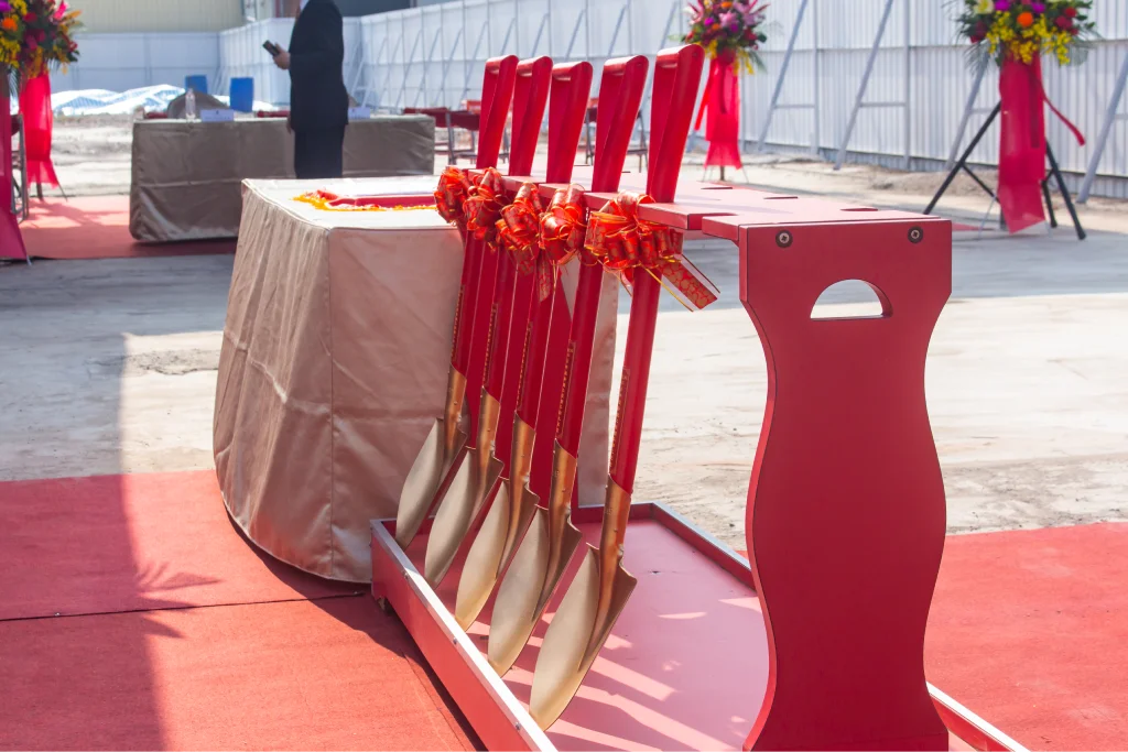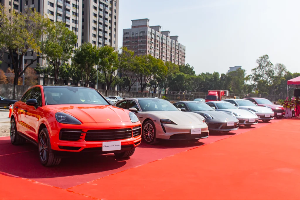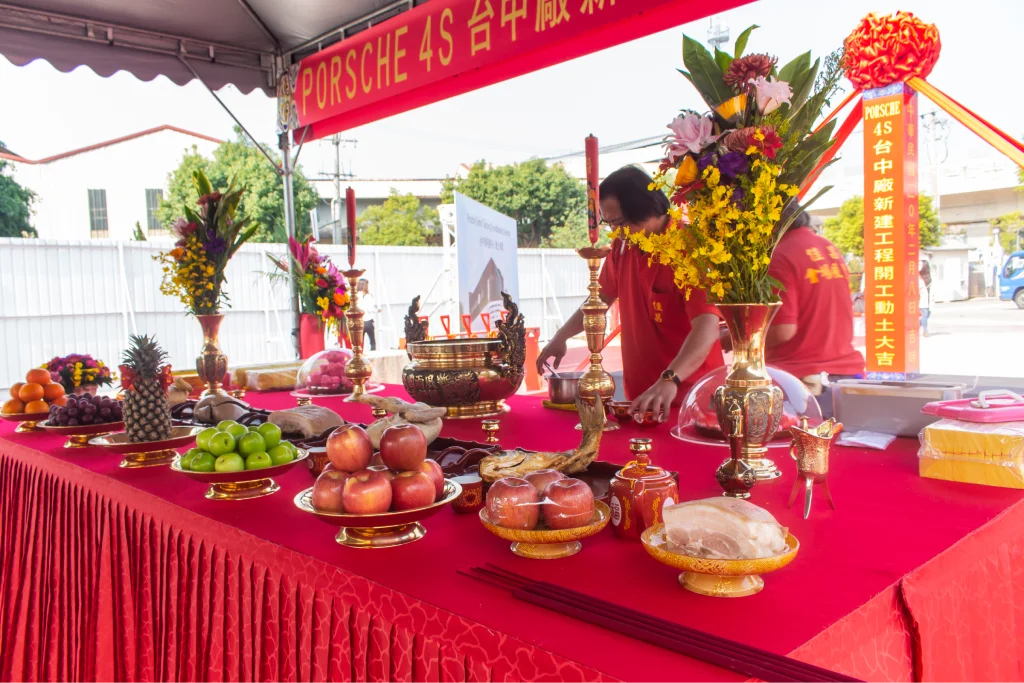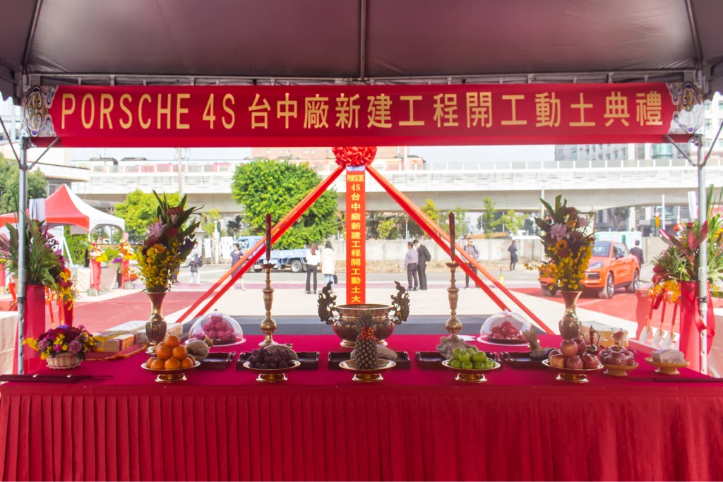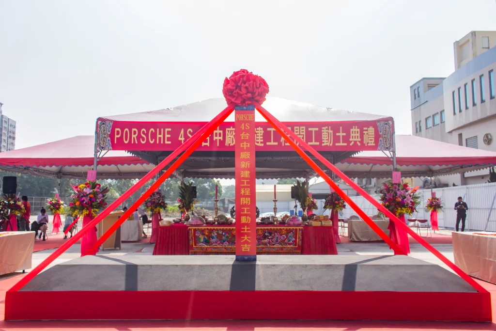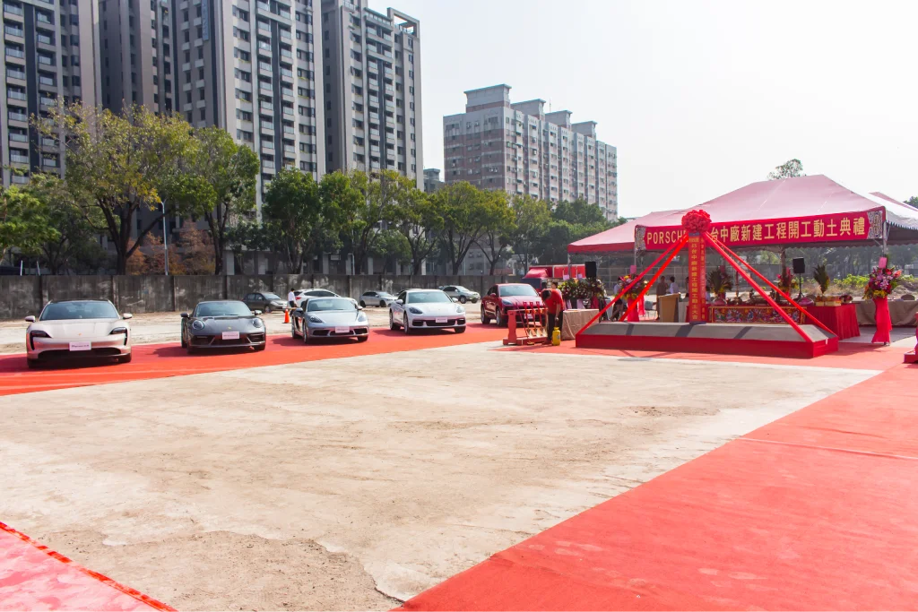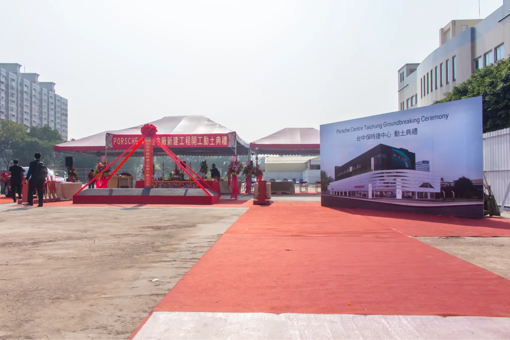 很高興台中保時捷新建專案動土儀式臨時邀請我們負責會場佈置。當天現場雲集了許多來自國外的貴賓,共襄盛舉。現場設置了迎賓背板供來賓拍照留念,並鋪設了紅地毯,增添典禮的莊重氛圍。多台保時捷豪車整齊停放在動土區旁,場面十分壯觀,展現出品牌的氣派和實力。這次活動不僅成功展示了保時捷的魅力,也讓我們的會場佈置服務再一次受到肯定。